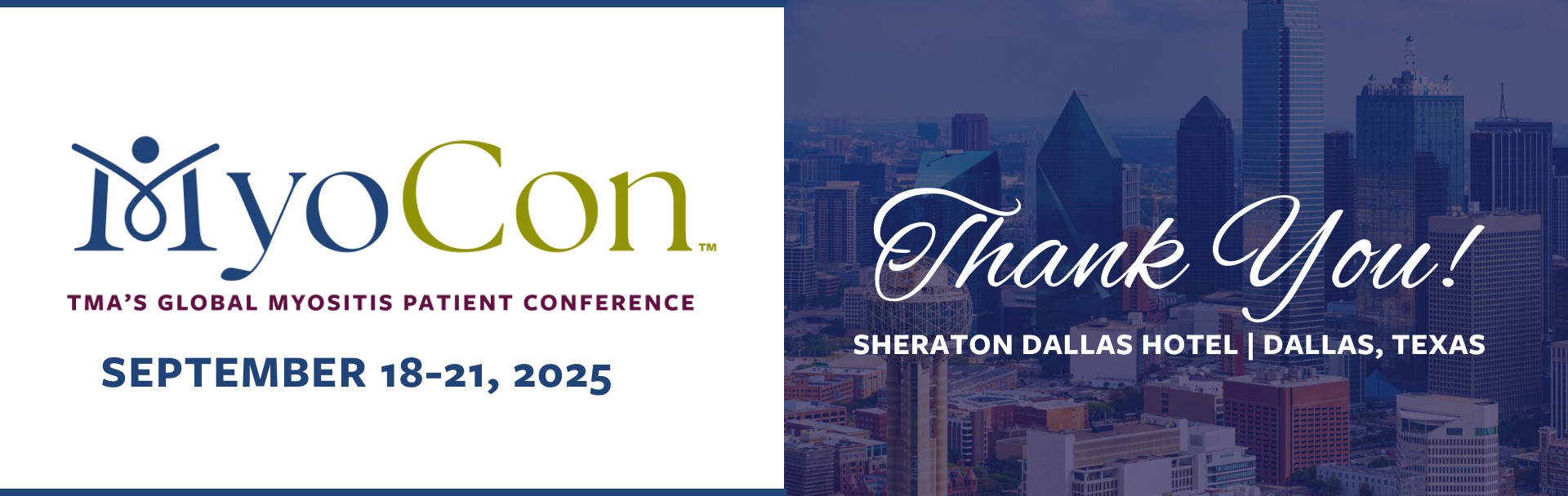 Sheraton Dallas Hotel | Dallas, TexasMyoCon 2025 takes place in Dallas, Texas on September 18-21. Join TMA friends and family for myositis education, inspiration, Heroes in the Fight, and World Myositis Day! Learn More about MyoCon 2025.