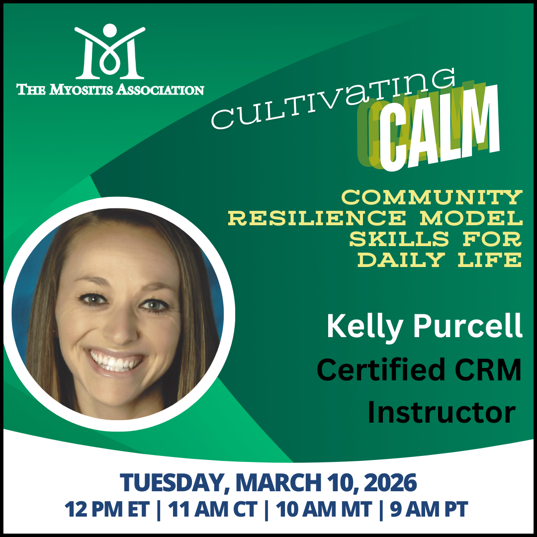 This session is designed for people with myositis and their care partners who want supportive, evidence-informed strategies to enhance emotional well-being and cultivate calm—one moment at a time.