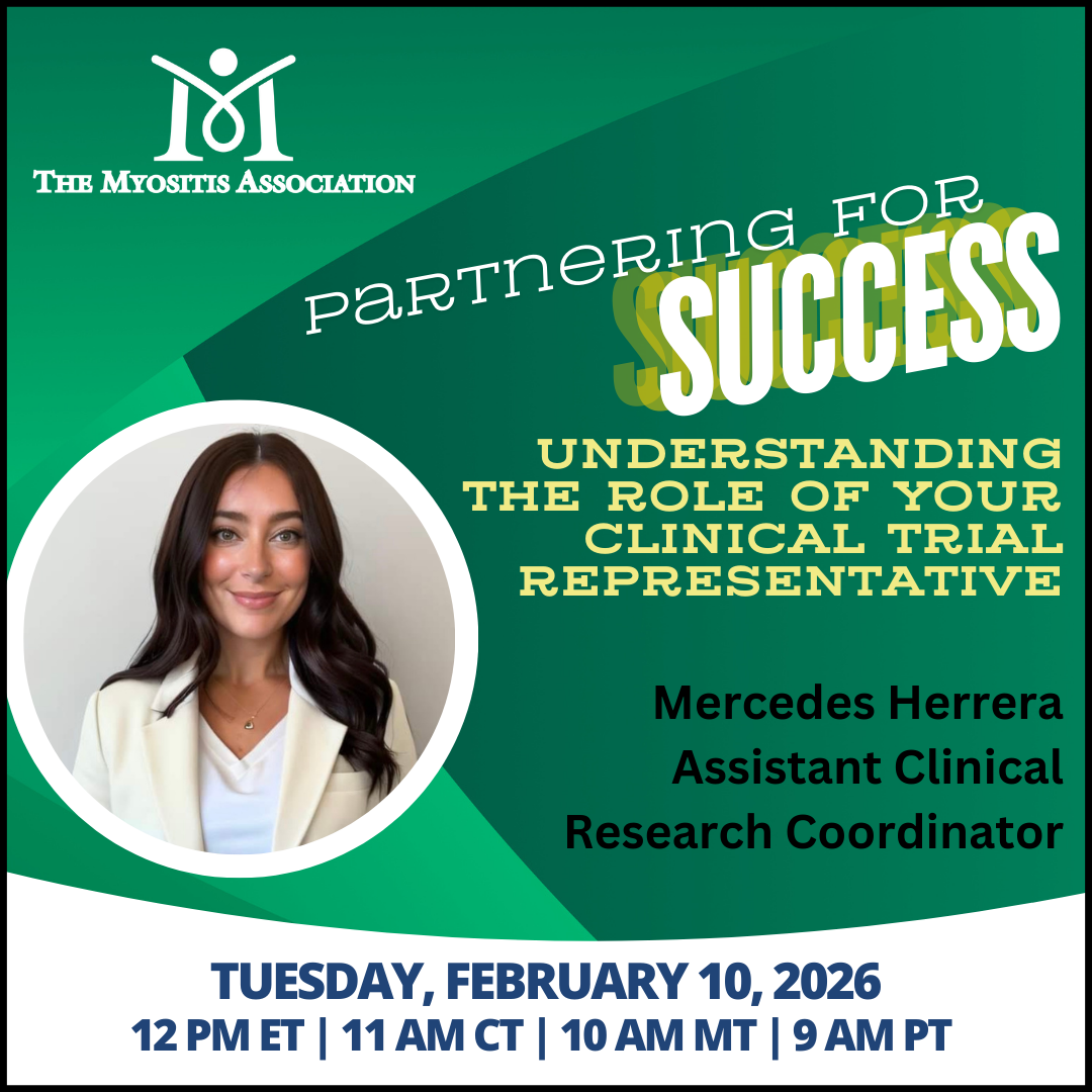 Speaker Mercedes Herrera joined the University of California, Irvine’s Neuromuscular Research Division over three years ago to contribute to the advancements of research. Her devotion for therapeutic advancements for myositis patients was strongly developed through her role as a Clinical Trial Representative, where she worked directly with patients that have Idiopathic Inflammatory Myopathies. Her role is to assist patients in identifying the most suitable clinical trial and provide ongoing support throughout the entire duration of the study. Her passion for patient advocacy and education inspired her to volunteer for The Myositis Association, where she can share her clinical trial experience to inform and empower patients.