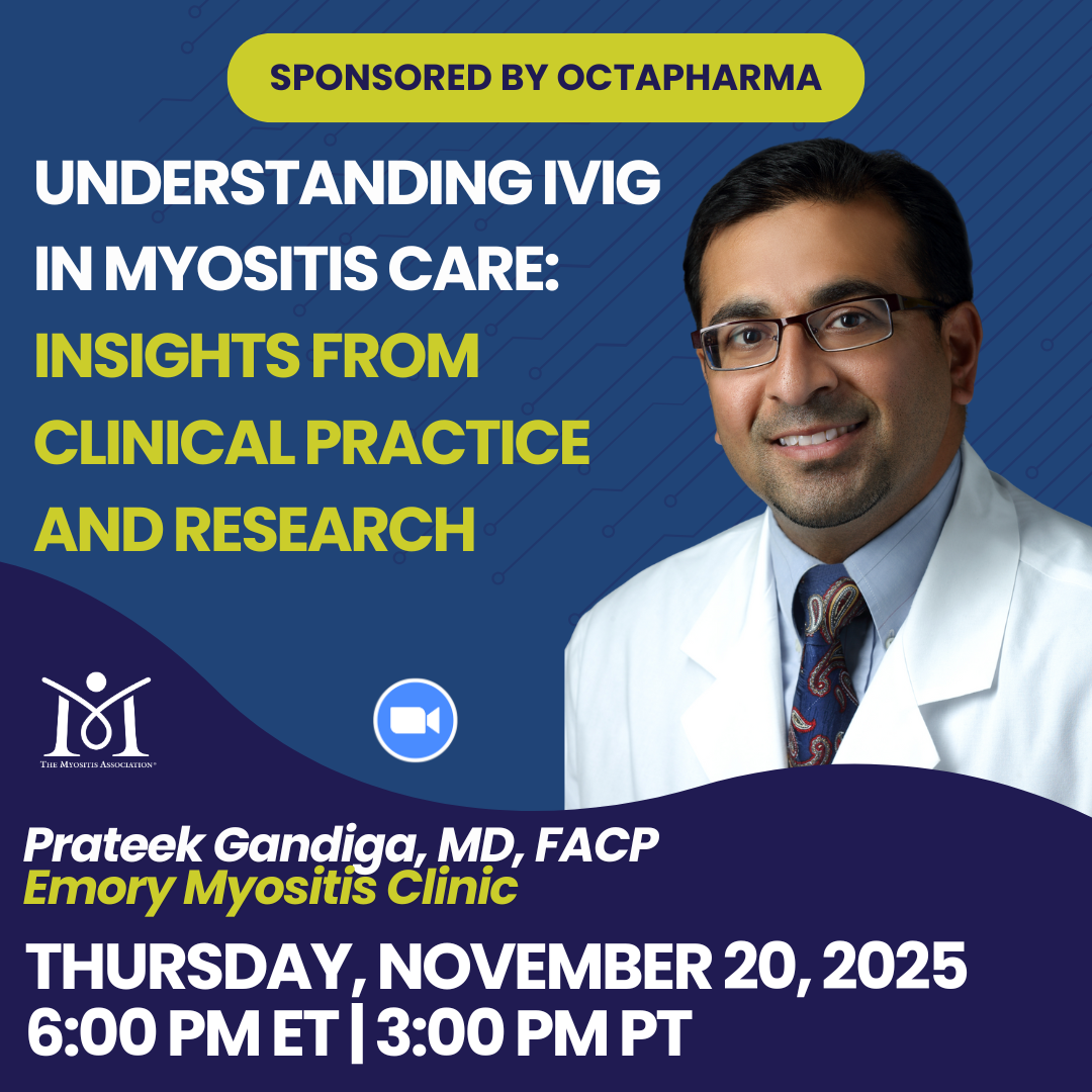 Join The Myositis Association for an in-depth discussion on the role of intravenous immunoglobulin (IVIG) in the treatment of myositis. Dr. Prateek Gandiga, Associate Professor of Medicine at Emory University and Senior Physician at Emory Clinic, will share his clinical experience and research insights on how IVIG can help manage autoimmune muscle diseases. Learn about treatment considerations, patient response, and emerging advances in immunotherapy.