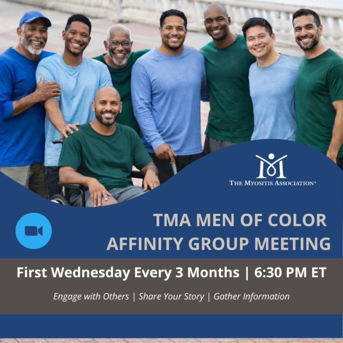 Thanks to the initiative of TMA’s Women of Color Affinity Group and group founders Sherrod Bundage and Mustafa Shameem in getting this off the ground, this new group meets quarterly on the first Wednesday as a way for men of color who are living with myositis to connect, share their stories, and learn more about myositis and how they can navigate the challenges of chronic disease. Register Here.